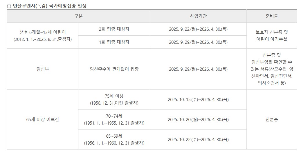 인플루엔자 예방접종은 생후 6개월 이상 어린이, 임신부, 65세 이상 어르신을 대상으로 진행됩니다.