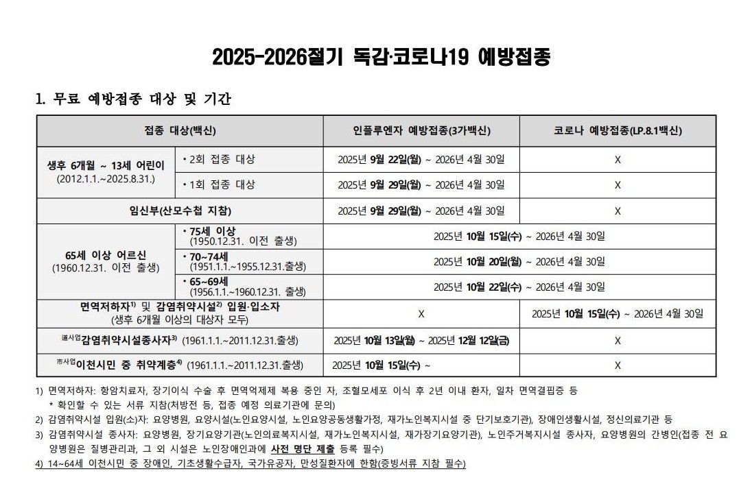 이천시는 어르신뿐 아니라 어린이(생후 6개월~13세) 및 임신부도 무료 독감 예방접종 대상에 포함됩니다.