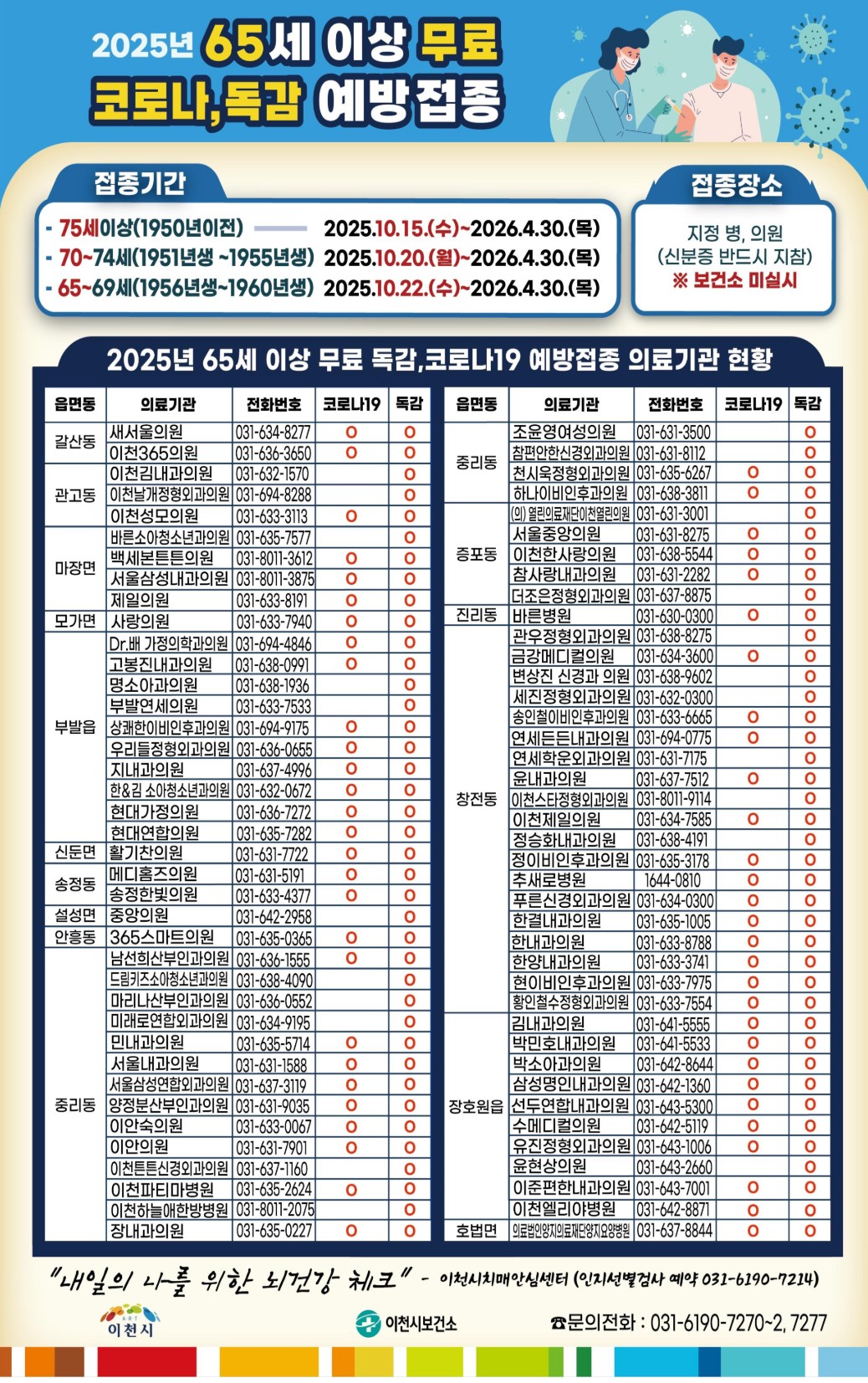 65세 이상 어르신은 이천시 지정 병·의원에서 무료로 접종받을 수 있습니다.
