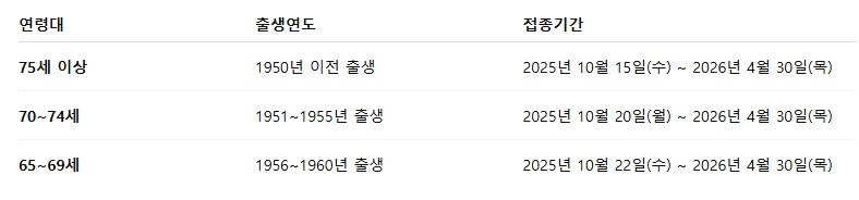 접종 시기와 대상은 연령대별로 다르니 아래 표를 꼭 확인하세요.