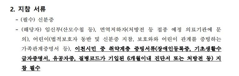- 취약계층: 장애인등록증, 기초생활수급자증명서, 유공자증, 진단서(최근 6개월 내 발급)