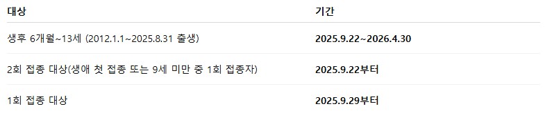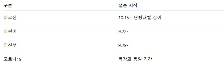 독감 예방접종과 동일 기간 진행되며, 가능한 동시 접종이 권장됩니다.