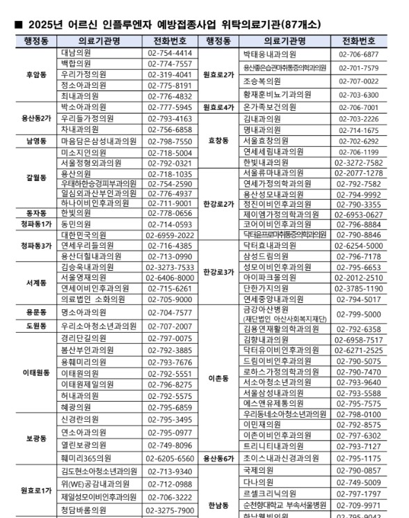 예를 들어 후암동, 남영동, 이태원동, 한남동, 효창동 등 87개소 이상의 위탁 병·의원에서 접종이 가능합니다.