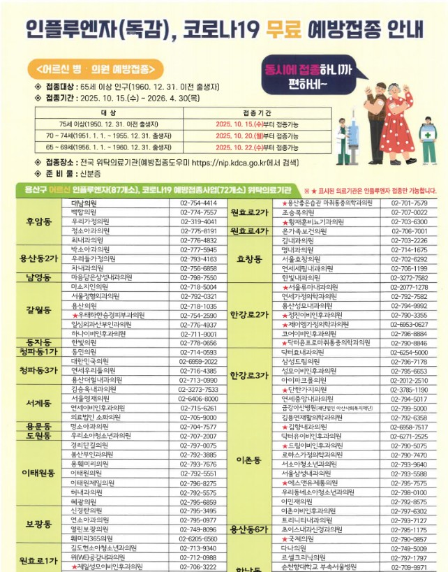 용산구독감예방접종 #용산구코로나19예방접종 #2025독감예방접종 #2026독감예방접종 #무료예방접종 #어르신예방접종 #어린이독감접종 #임신부독감접종 #독감무료접종 #코로나무료접종 #예방접종도우미 #국가예방접종 #용산구의료기관 #용산구병원 #건강정보 #겨울철건강관리 #면역력관리 #독감증상예방 #백신접종안내