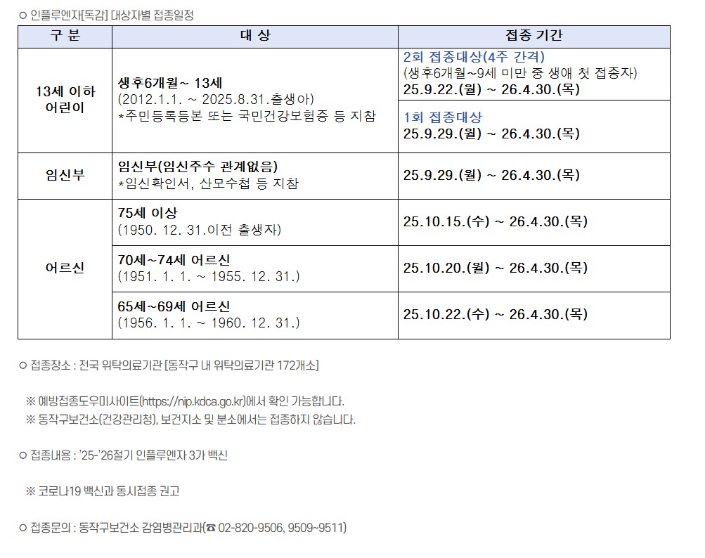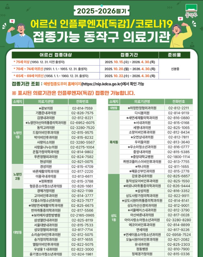 2025-2026절기 동작구 인플루엔자(독감) 및 코로나19 무료 접종 정보가 공개되어, 대상·일정·접종 가능한 동작구 병원 리스트까지 한눈에 정리해드립니다.