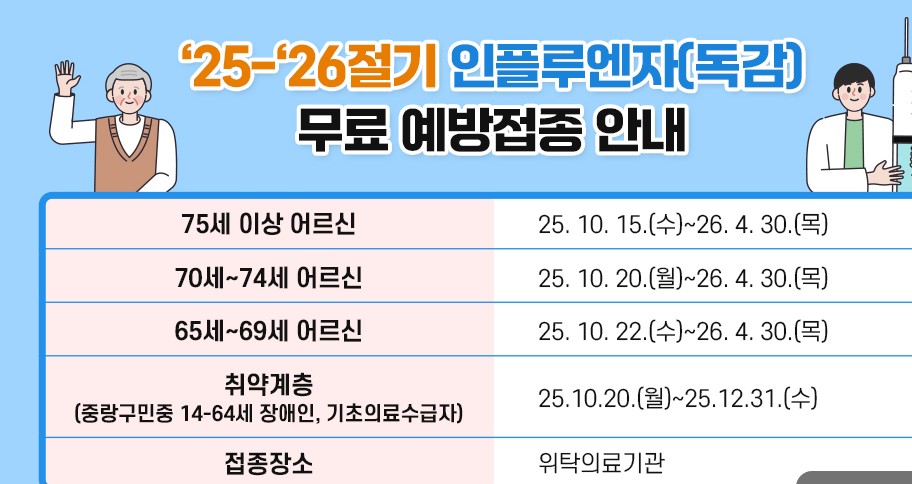 중랑구에서도 2025-2026절기 인플루엔자 무료 예방접종을 진행합니다.