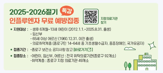 올해도 서울 종로구에서 2025-2026절기 인플루엔자 및 코로나19 무료 접종을 실시합니다.