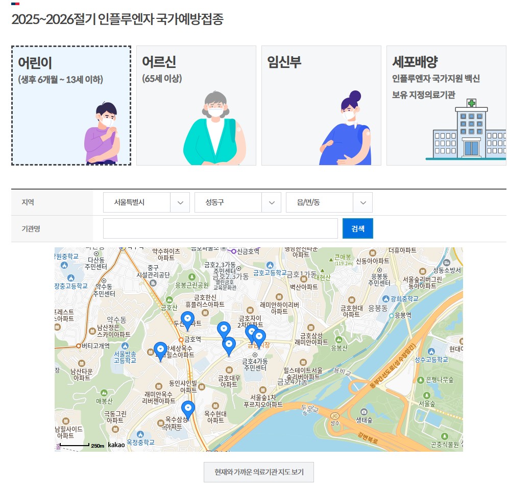 “예방접종 위탁의료기관 찾기” 메뉴에서 병원 위치 확인이 가능합니다.